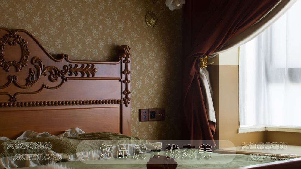 臥室床頭采用簡單的石膏角線和一些壁紙來豐富女主的喜好和個性,實木復(fù)古床頭與常規(guī)窗簾掛法不同,展現(xiàn)女主細膩的性格和高雅的審美。