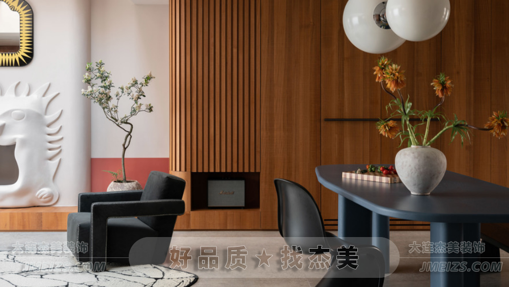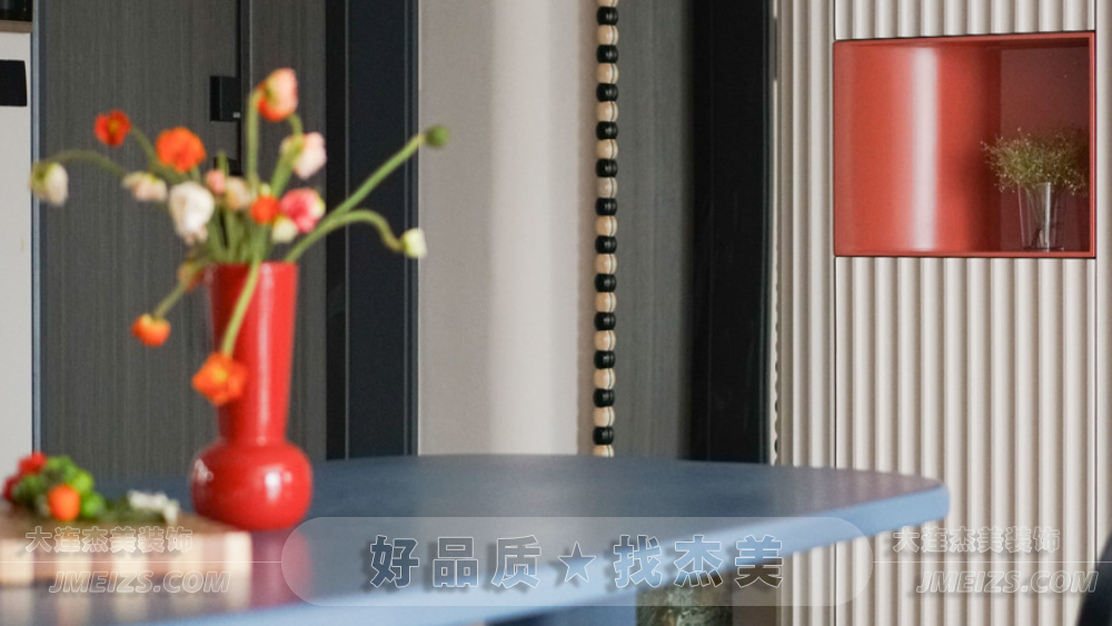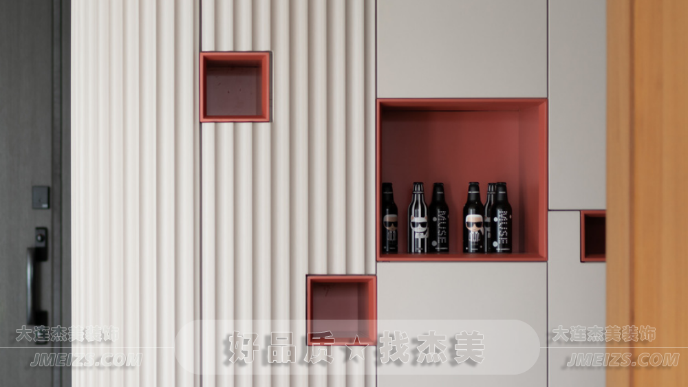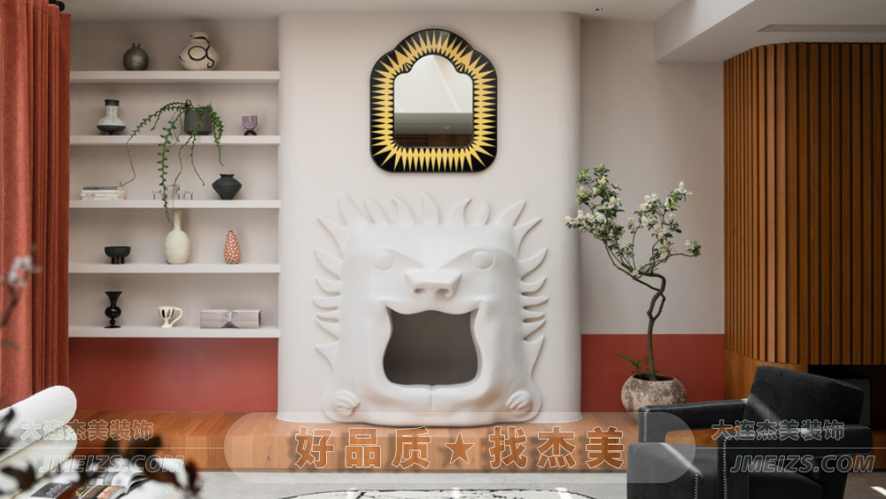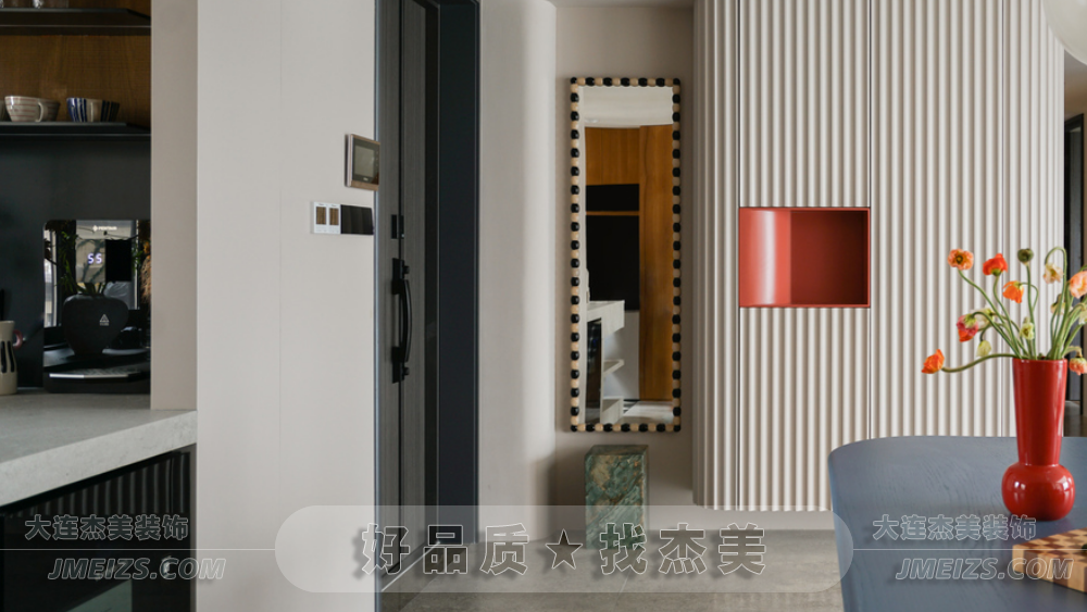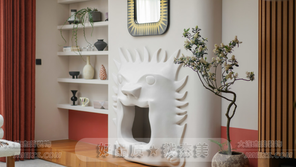 玄關設計:玄關的設計充分考慮了空間的功能性和視覺效果。正對入戶門的位置設計了兩根羅馬柱,作為裝飾隔斷,旨在規劃出玄關區域并增強進門的視野層次感。此外,玄關處還安排了換鞋凳和全身鏡,為屋主提供了方便的換鞋和整理外觀的空間。柜門上的波浪造型與羅馬柱相呼應,糖果串珠邊框的全身鏡和紅色的弧形開放格都展現了獅子座的熱情奔放和不拘一格的特點。大理石換鞋凳的設計則是對空間的一種巧妙利用,既實用又具有裝飾性。