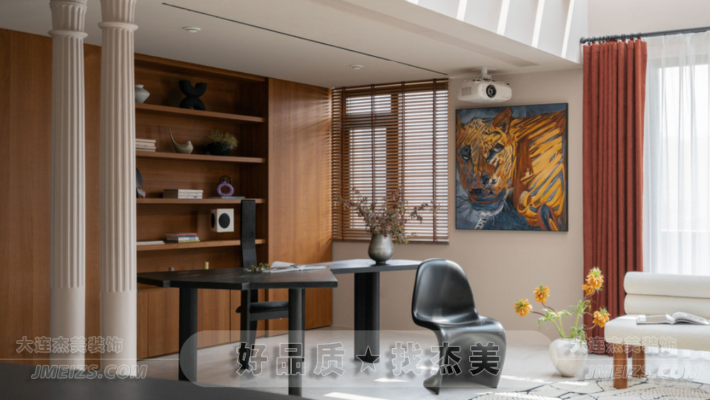 光柵屋頂的設計使得陽光可以透過屋頂打在書柜上,為空間帶來了光影的變化。書柜中間的開放格設計用于放置常用書籍和一些屋主喜歡的擺件,而左右兩側的大扇移門則為屋主提供了豐富的收納空間。客廳的C位是男屋主要求的“獅子”元素,上方吊頂設計了一個燈槽,并內置了投影幕布。獅子頭的設計是通過自己建模并傳到雕塑廠家定制生產的,選用的水泥材質使得冬天可以在獅子嘴巴里放置真火壁爐,為空間增添了溫馨和舒適感。