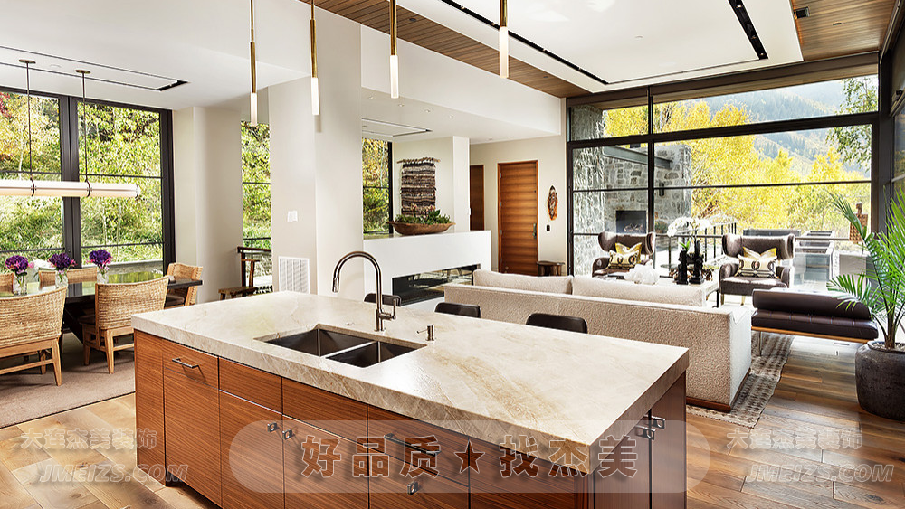這個(gè)開(kāi)放式廚房是一個(gè)完美融合了現(xiàn)代設(shè)計(jì)和自然美景的空間。