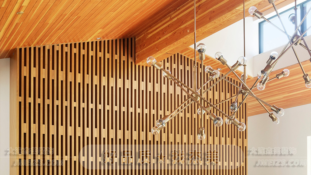 木質(zhì)的天花板板條呈現(xiàn)了溫暖的色調(diào)和細(xì)膩的紋理,